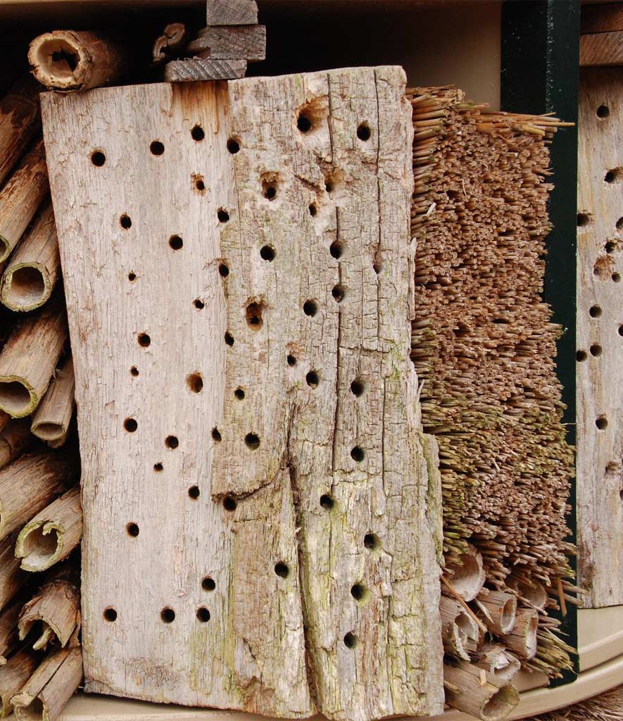 3. Beim Füllen solltet Ihr ausschließlich Naturmaterialien verwenden wie z.B.: Schilfhalme, Lehmziegel/-blöcke oder Holzstücke mit gebohrten Gängen. Bei den Holzblöcken ist es wichtig, die Gänge immer gegen die Faserung zu bohren. Es sollte also immer von Rinde Richtung Kern gebohrt werden.